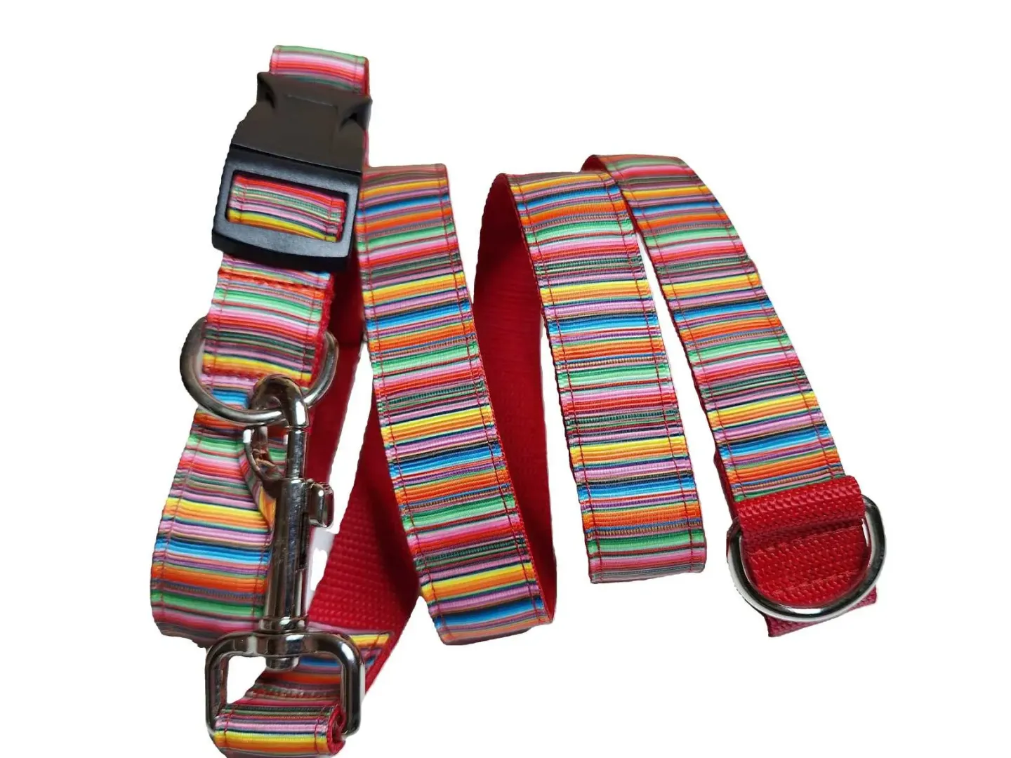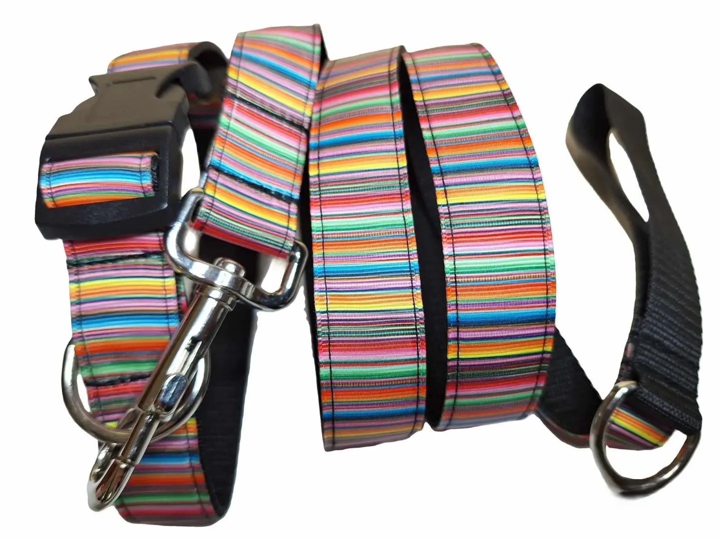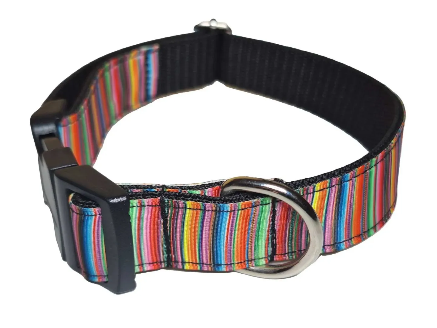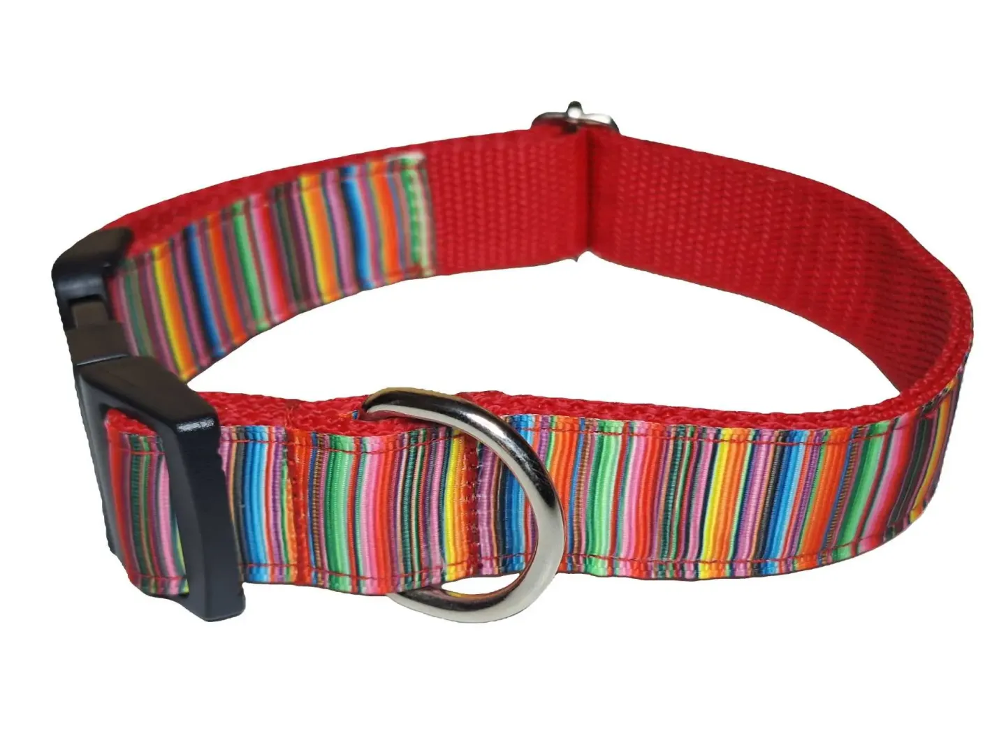 Ezt a nyakörvet közepes és nagyobb testű kutyáknak ajánljuk. A képen látható nyakörv és póráz színes csíkos mintás szalaggal, piros és fekete hevederrel van varrva. De a felsorolt heveder színek közül bármelyikkel kérhető.