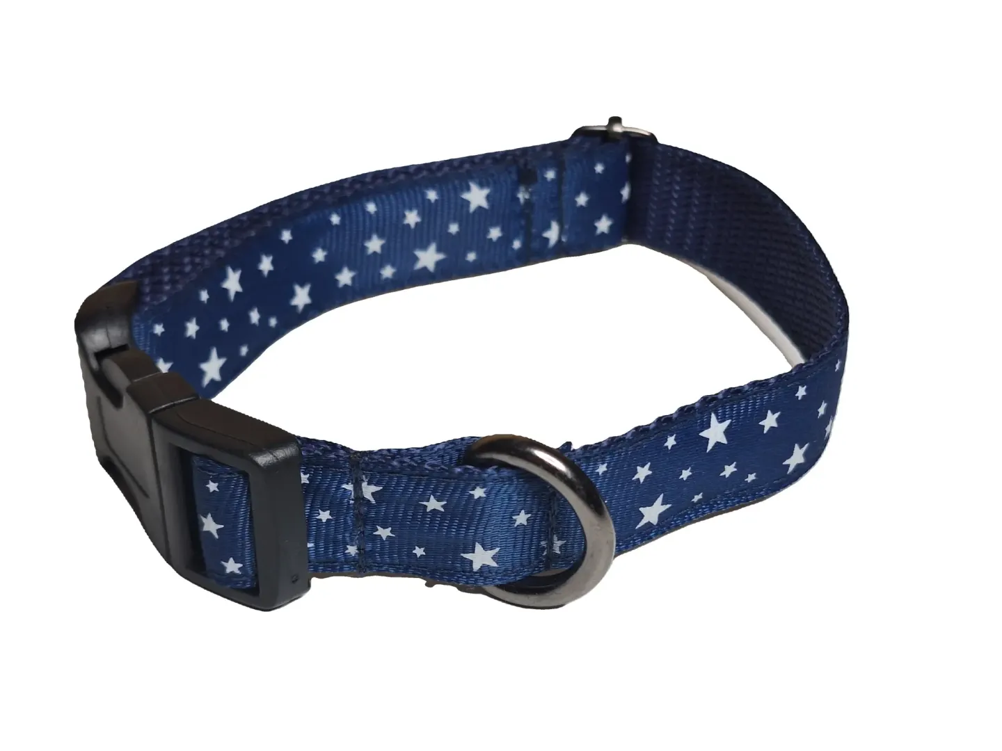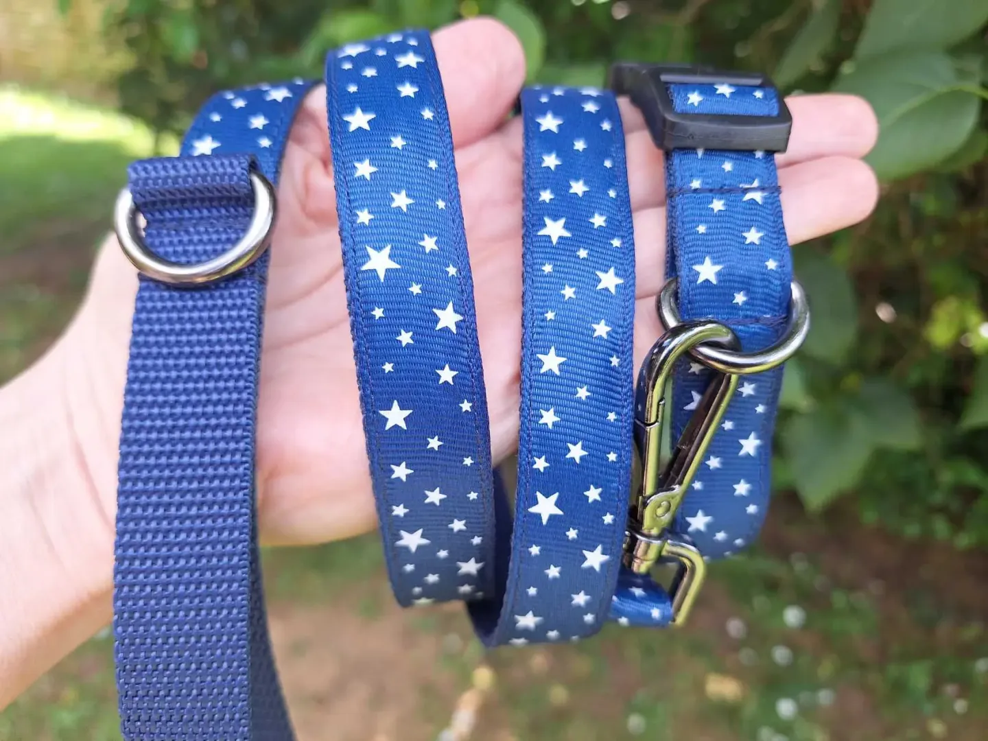 Ezt a nyakörvet kisebb testű kutyáknak ajánljuk. Ez a cuki nyakörv kék csillagos mintás szalaggal és kék hevederrel van varrva. De a felsorolt heveder színek közül bármelyikkel kérhető.