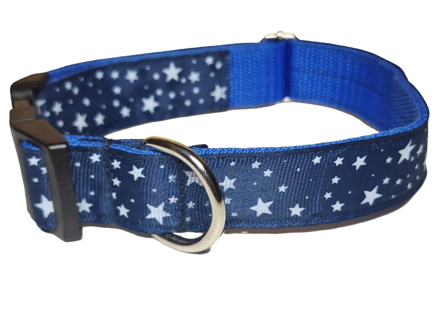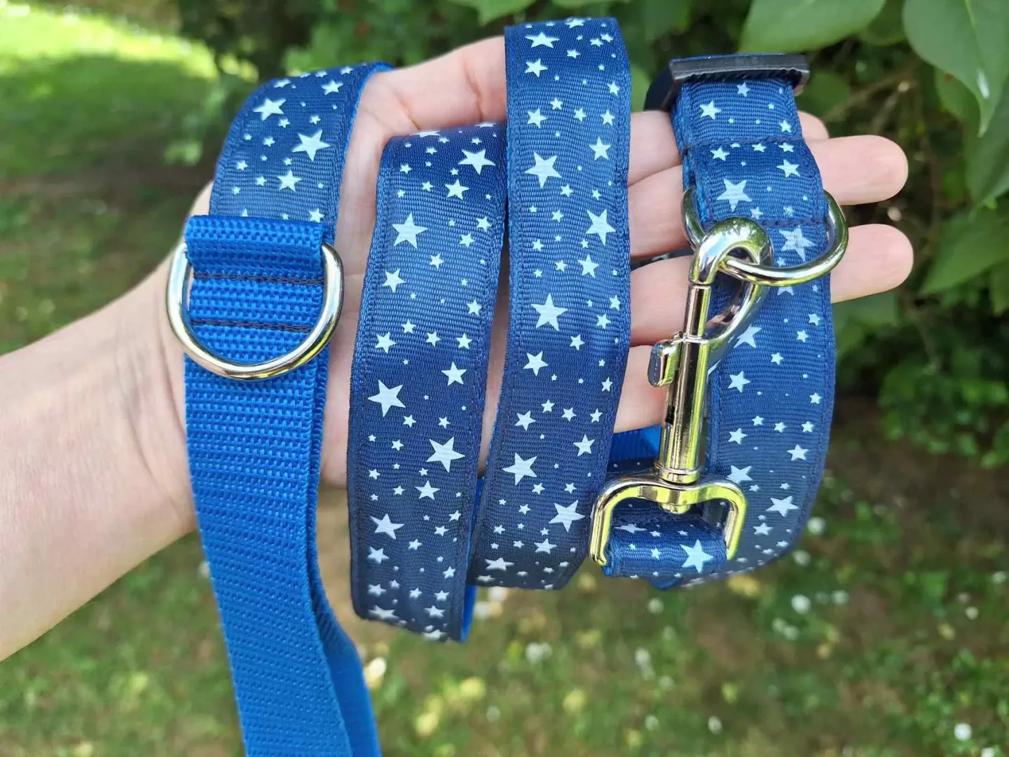 Ezt a nyakörvet közepes és nagyobb testű kutyáknak ajánljuk. A képen látható nyakörv kék csillag mintás szalaggal és kék hevederrel van varrva. De a felsorolt heveder színek közül bármelyikkel kérhető.