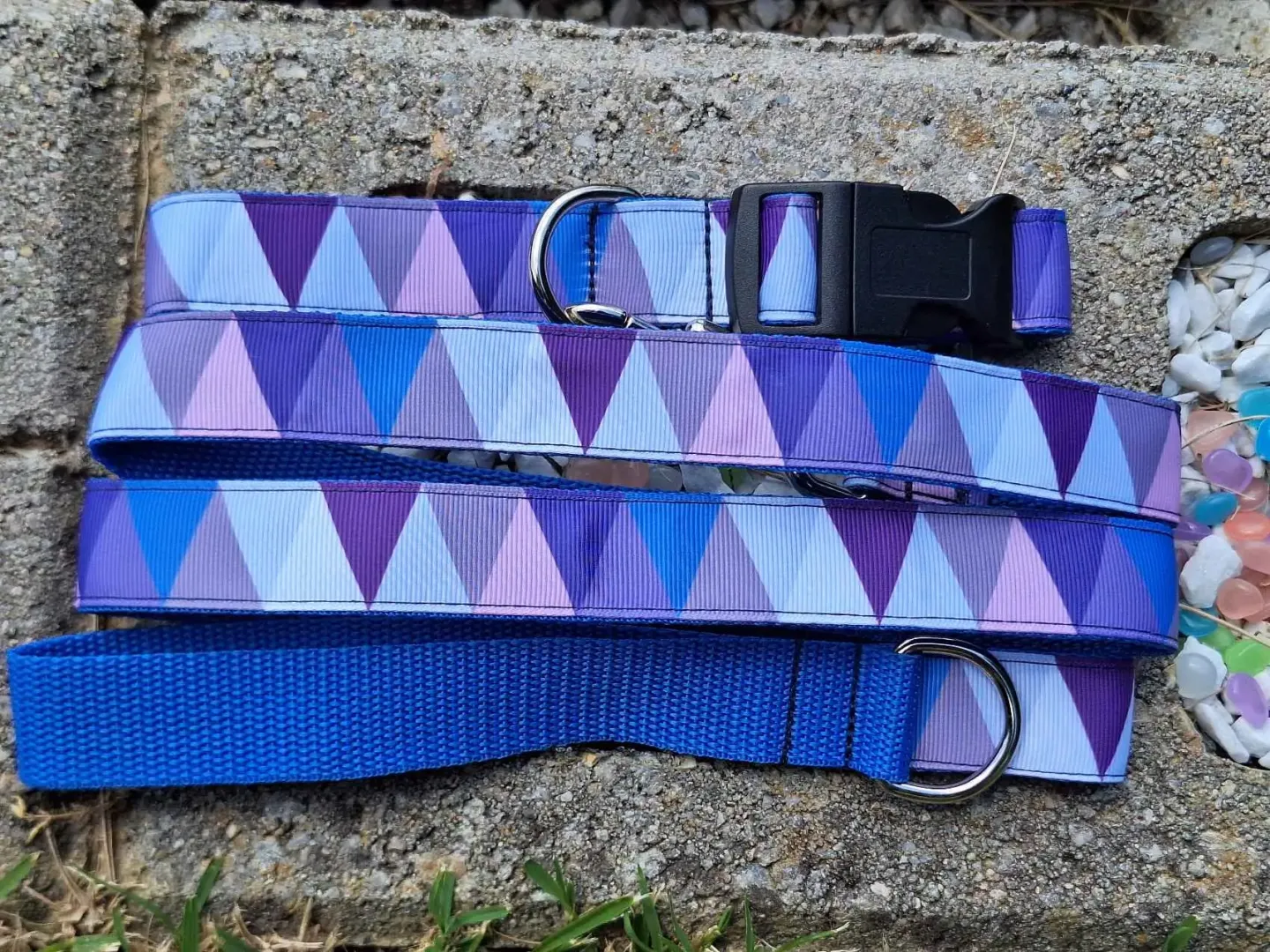 Ezt a nyakörvet közepes és nagyobb testű kutyáknak ajánljuk. A képen látható nyakörv kék mozaik mintás szalaggal és kék hevederrel van varrva. De a felsorolt heveder színek közül bármelyikkel kérhető.