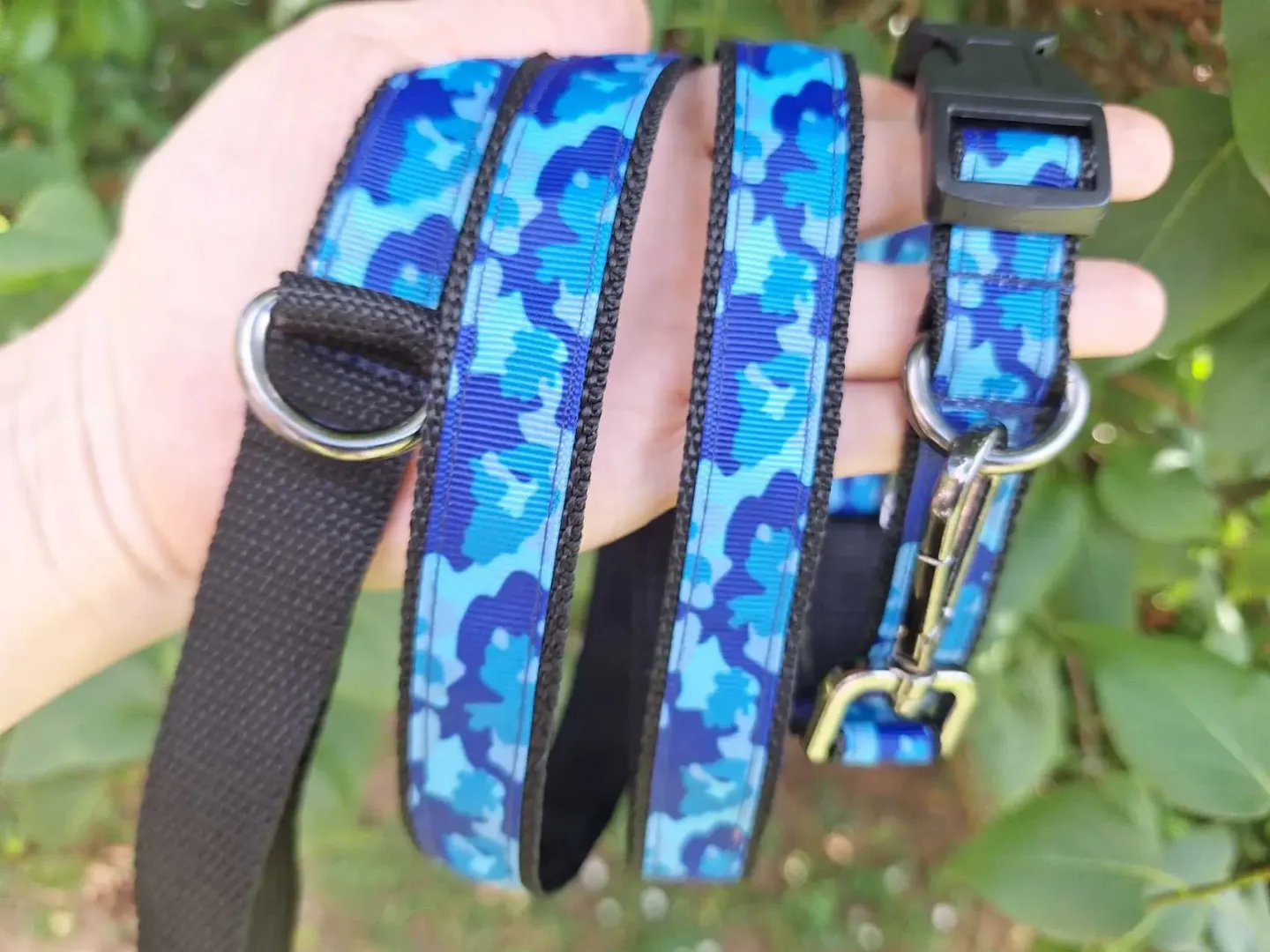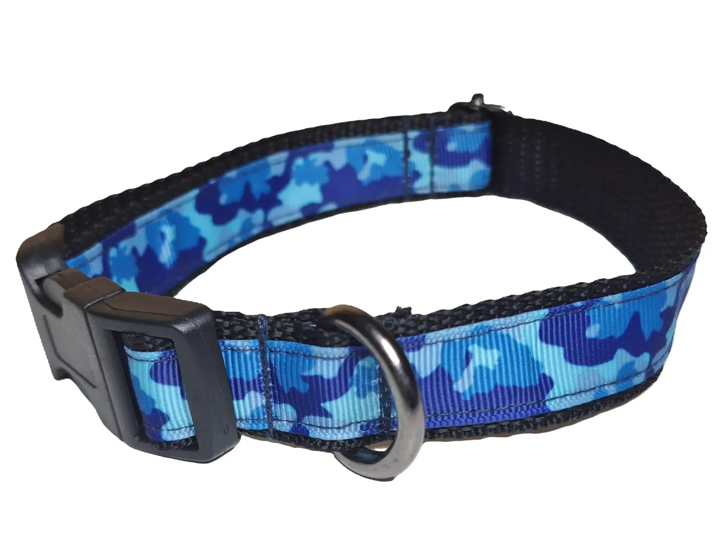 Ezt a nyakörvet kisebb testű kutyáknak ajánljuk. Ez a cuki nyakörv kék terepmintás szalaggal és fekete hevederrel van varrva. De a felsorolt heveder színek közül bármelyikkel kérhető.
