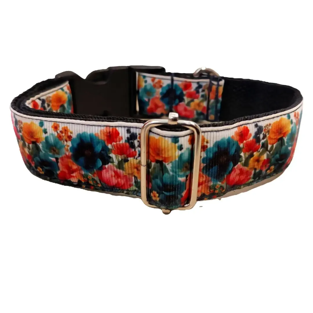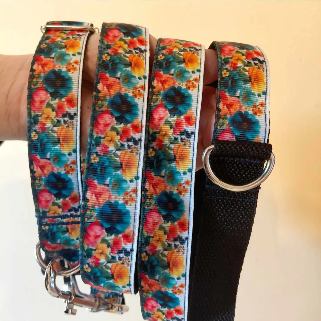 Ezt a nyakörvet közepes és nagyobb testű kutyáknak ajánljuk. A képen látható nyakörv és póráz kék virágos szalaggal, és fekete hevederrel van varrva. De a felsorolt heveder színek közül bármelyikkel kérhető.