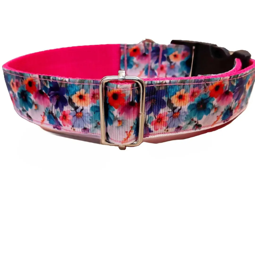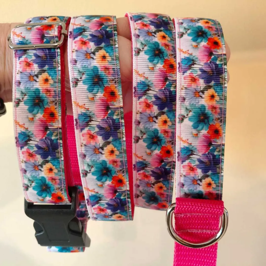 Ezt a nyakörvet közepes és nagyobb testű kutyáknak ajánljuk. A képen látható nyakörv és póráz lila virágos szalaggal, és rózsaszín hevederrel van varrva. De a felsorolt heveder színek közül bármelyikkel kérhető.