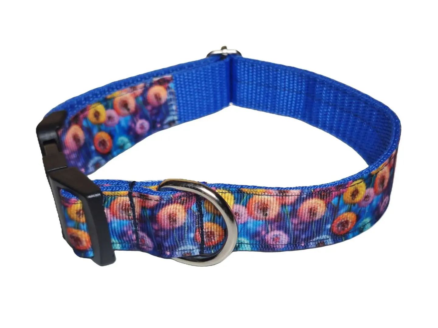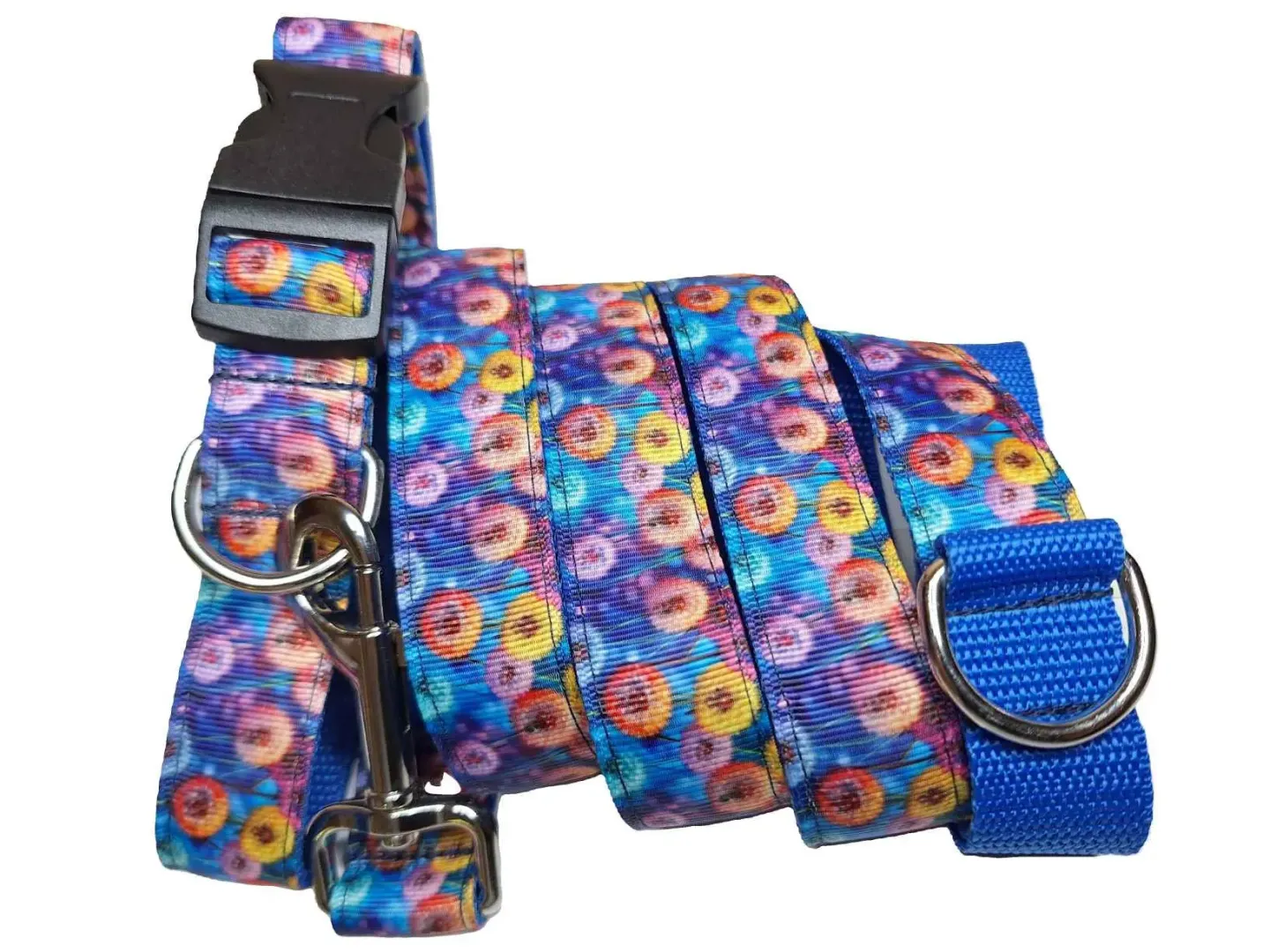 Ezt a nyakörvet közepes és nagyobb testű kutyáknak ajánljuk. A képen látható nyakörv és póráz margaréta mintás szalaggal, és kék hevederrel van varrva. De a felsorolt heveder színek közül bármelyikkel kérhető.