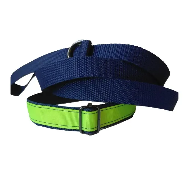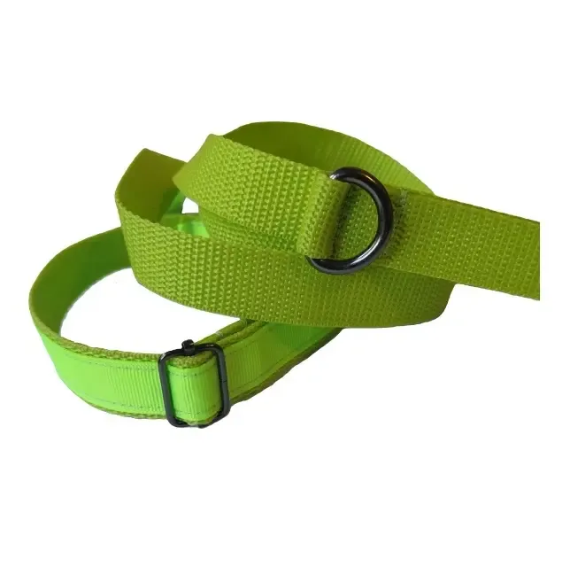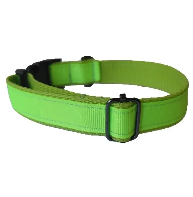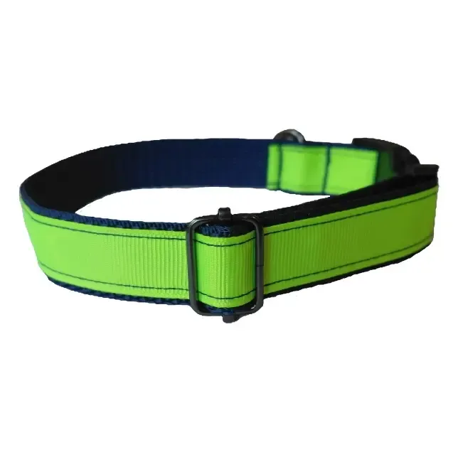 Ezt a nyakörvet kisebb testű kutyáknak ajánljuk. Ez a nyakörv neonzöld szalaggal és zöld és kék hevederrel van varrva. A póráz rávart szalag nélkül csak a kíválasztott hevederrel színnel kérhető.