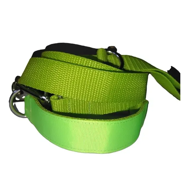 Ezt a nyakörvet közepes és nagyobb testű kutyáknak ajánljuk. A képen látható nyakörv neonzöld szalaggal és zöld hevederrel van varrva. A póráz rávart szalag nélkül csak a kíválasztott hevederrel színnel kérhető.