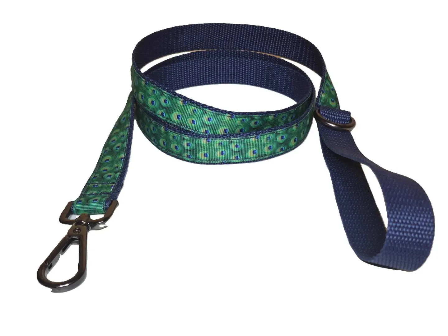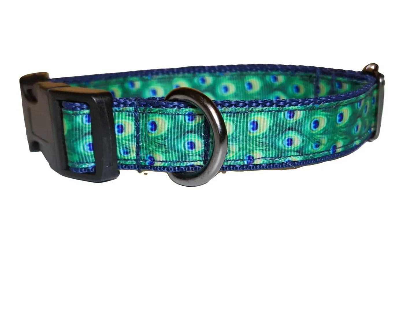 Ezt a nyakörvet kisebb testű kutyáknak ajánljuk. Ez a cuki nyakörv pávatoll mintás szalaggal és kék hevederrel van varrva. De a felsorolt heveder színek közül bármelyikkel kérhető.