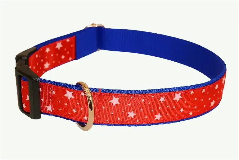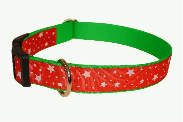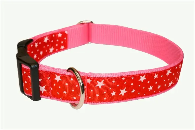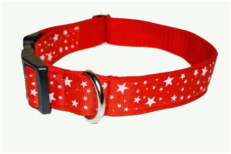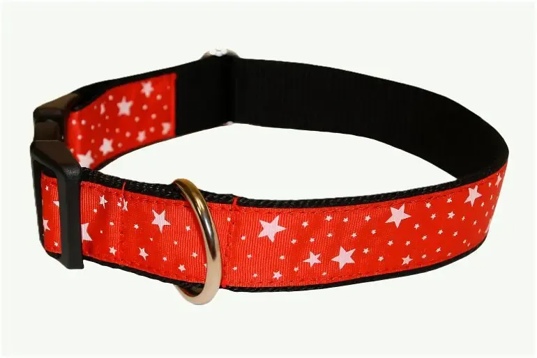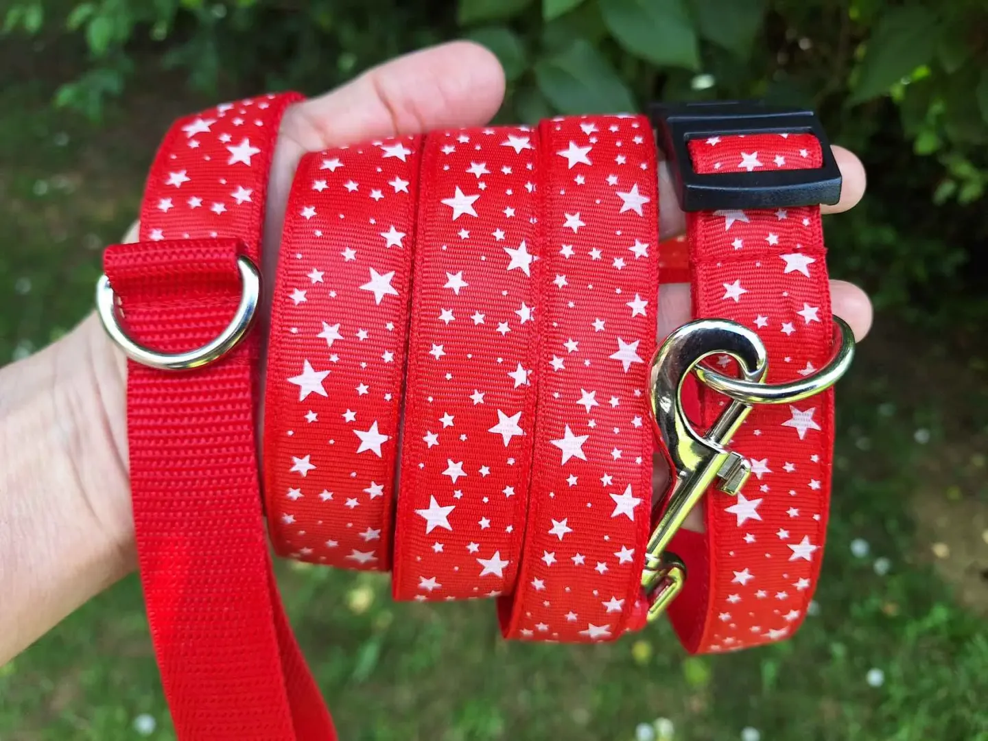 Ezt a nyakörvet közepes és nagyobb testű kutyáknak ajánljuk. A képen látható nyakörv piros csillag mintás szalaggal és piros hevederrel van varrva. De a felsorolt heveder színek közül bármelyikkel kérhető.