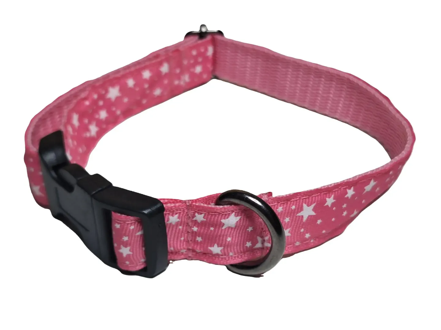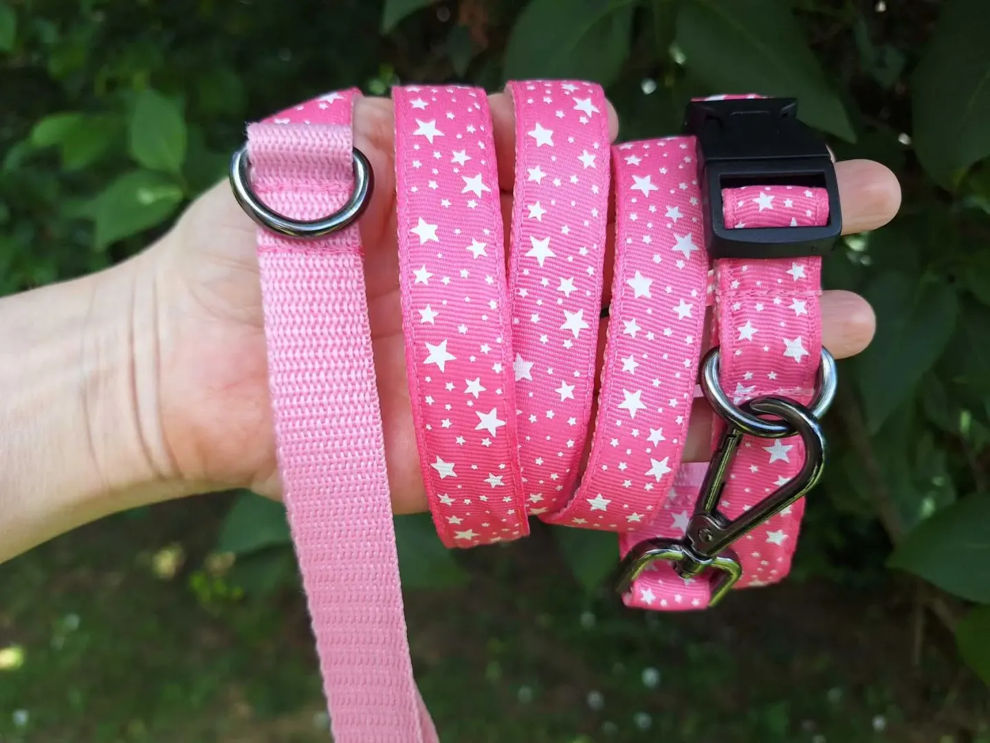 Ezt a nyakörvet kisebb testű kutyáknak ajánljuk. Ez a cuki nyakörv rózsaszín csillagos mintás szalaggal és rózsaszín hevederrel van varrva. De a felsorolt heveder színek közül bármelyikkel kérhető.