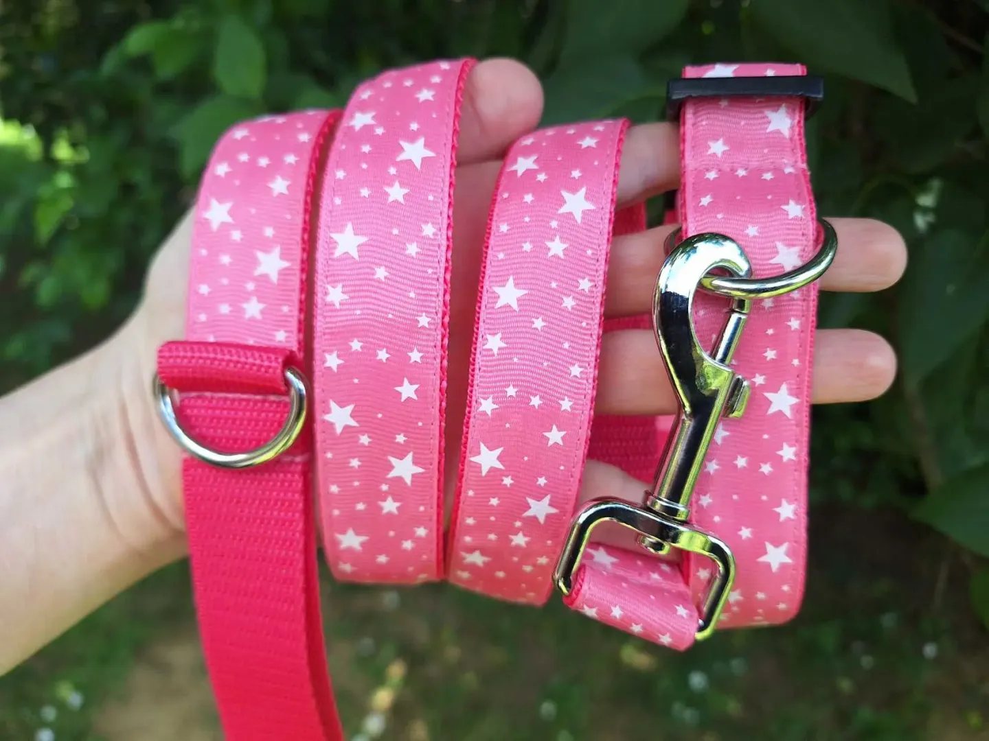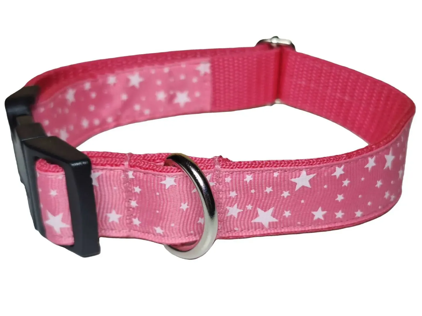 Ezt a nyakörvet közepes és nagyobb testű kutyáknak ajánljuk. A képen látható nyakörv rózsaszín csillag mintás szalaggal és rózsaszín hevederrel van varrva. De a felsorolt heveder színek közül bármelyikkel kérhető.