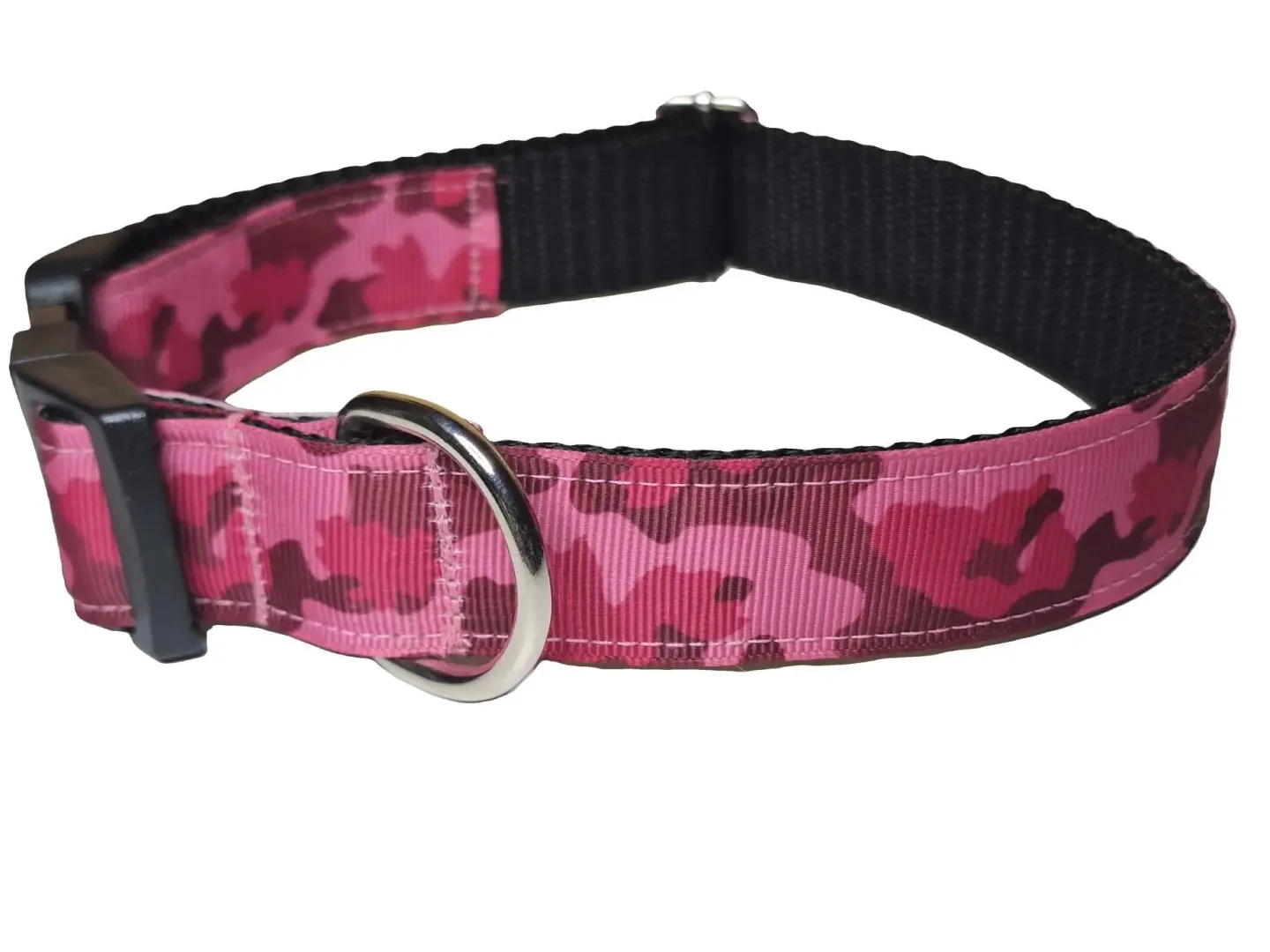 Ezt a nyakörvet közepes és nagyobb testű kutyáknak ajánljuk. A képen látható nyakörv és póráz rózsaszín terepmintás szalaggal, és fekete hevederrel van varrva. De a felsorolt heveder színek közül bármelyikkel kérhető.