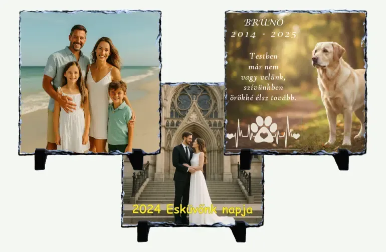 Valódi vágott terméskő fehérre festett felülettel, amire 18,5 x 18,5 centiméteres fényképet tudunk nyomtatni. Ez a kőlap tökéletes ajándék lehet kiskutyád emlékére, házassági évfordúlóra, születésnapra, névnapra, valentín napra, ballagásra, karácsonyra vagy emlék szeretteinknek.