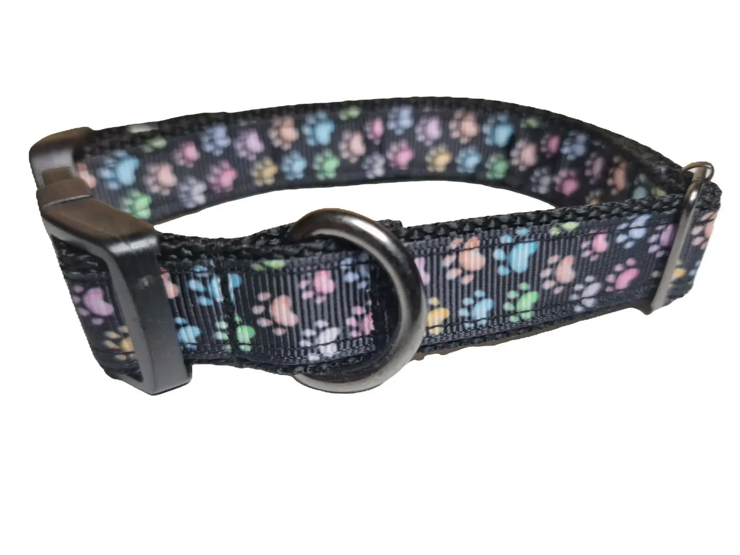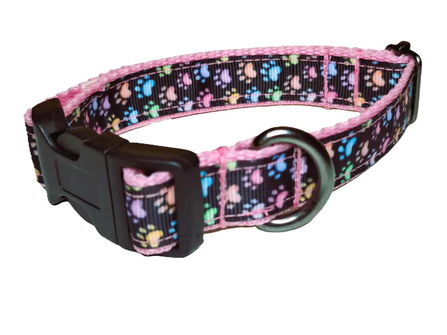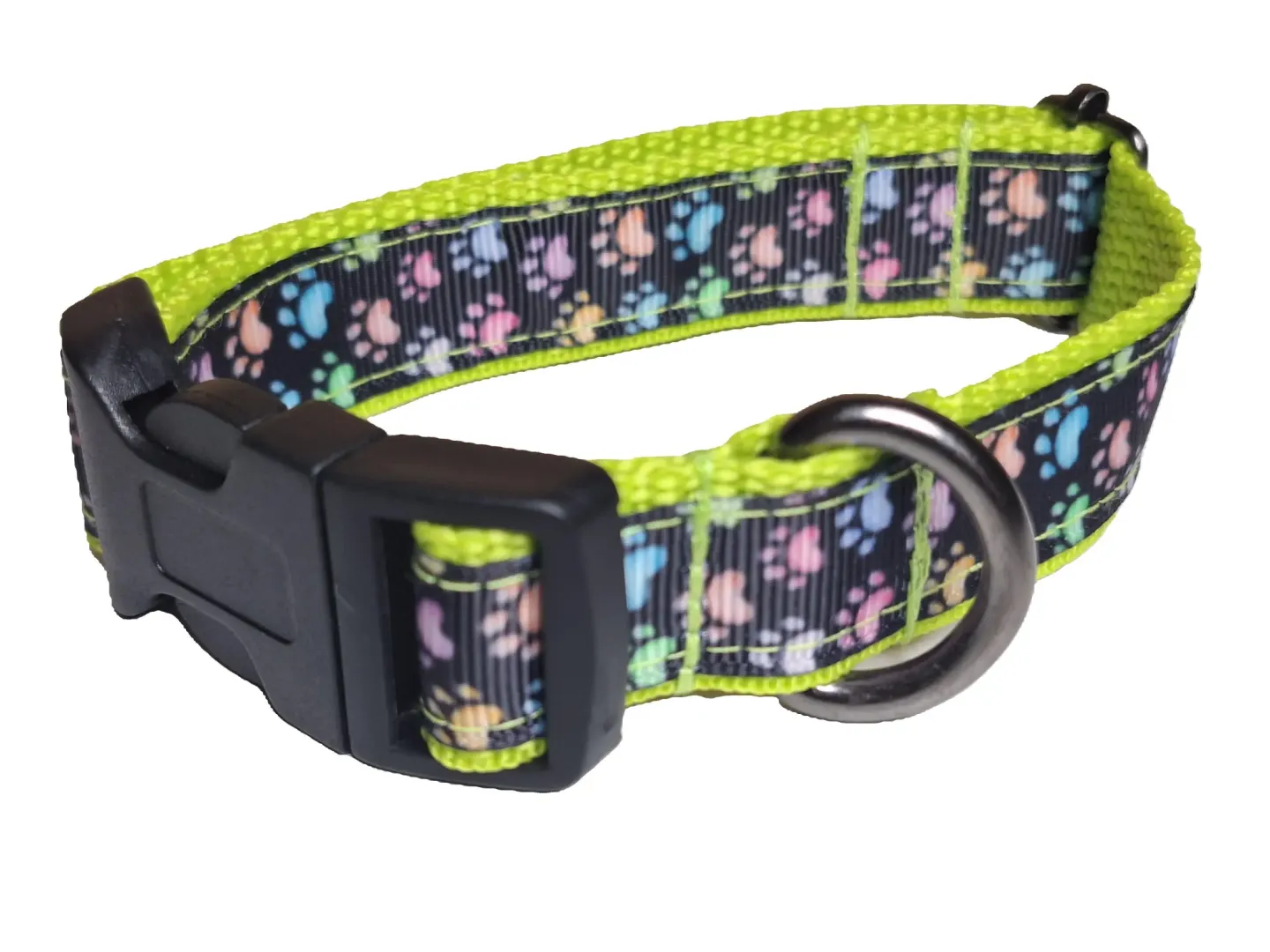 Ezt a nyakörvet kisebb testű kutyáknak ajánljuk. A képen látható nyakörvek tappancs mintás szalaggal és fekete , rózsaszín, zöld hevederrel vannak varrva. De a felsorolt heveder színek közül bármelyikkel kérhető.