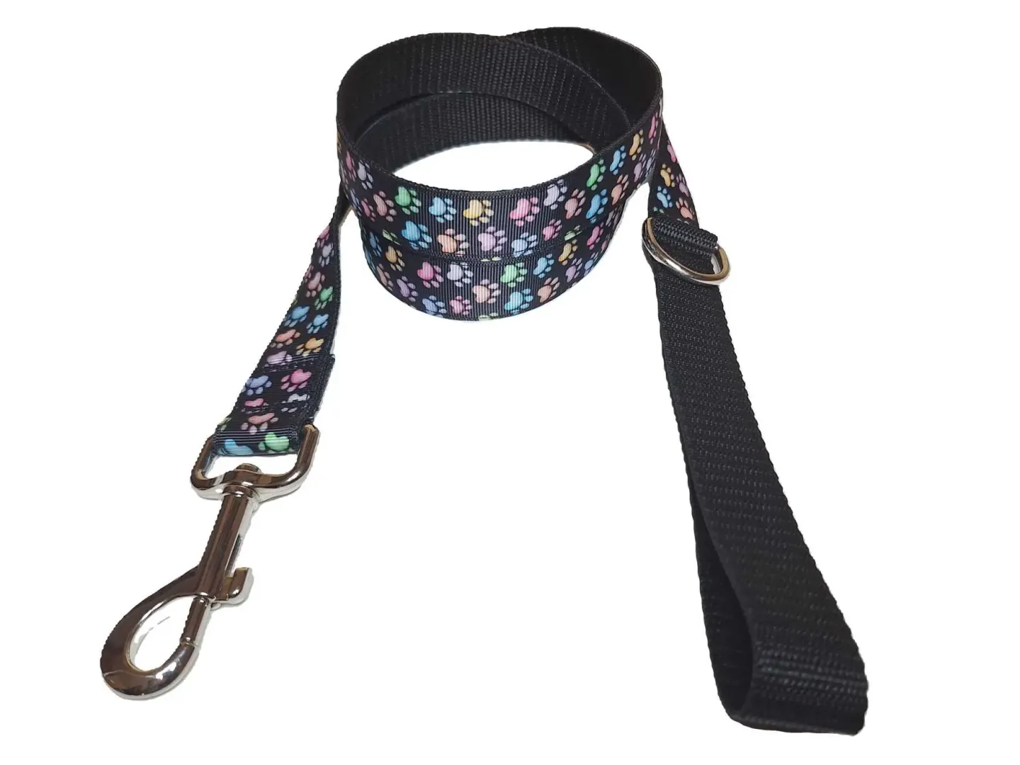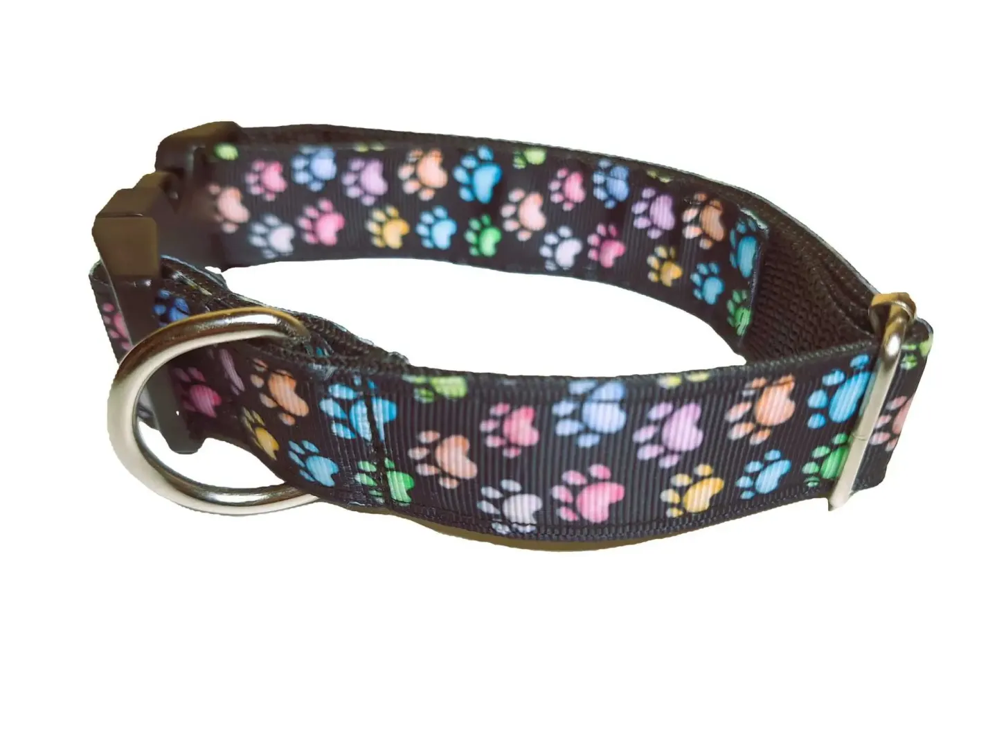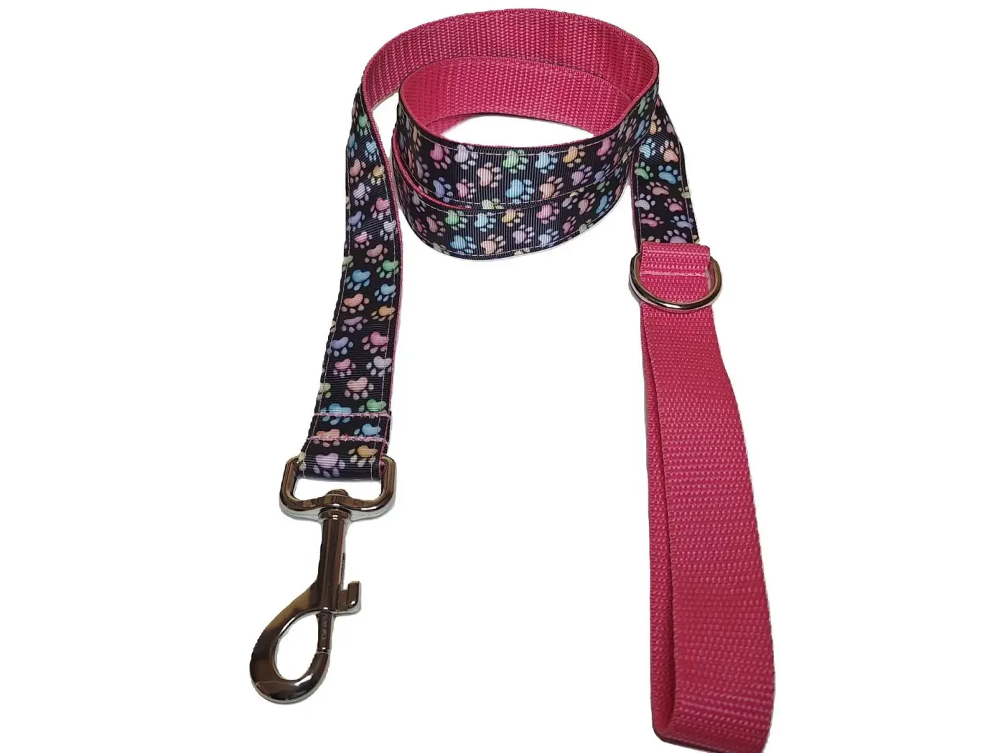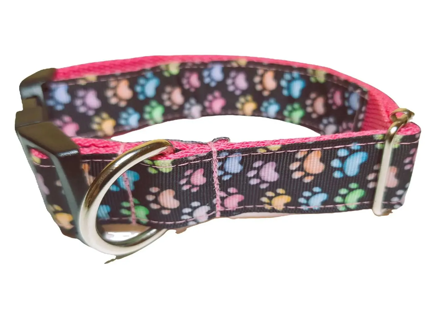 Ezt a nyakörvet közepes és nagyobb testű kutyáknak ajánljuk. A képen látható nyakörv és póráz tappancs mintás szalaggal és fekete, és rózsaszín hevederrel van varrva. De a felsorolt heveder színek közül bármelyikkel kérhető.