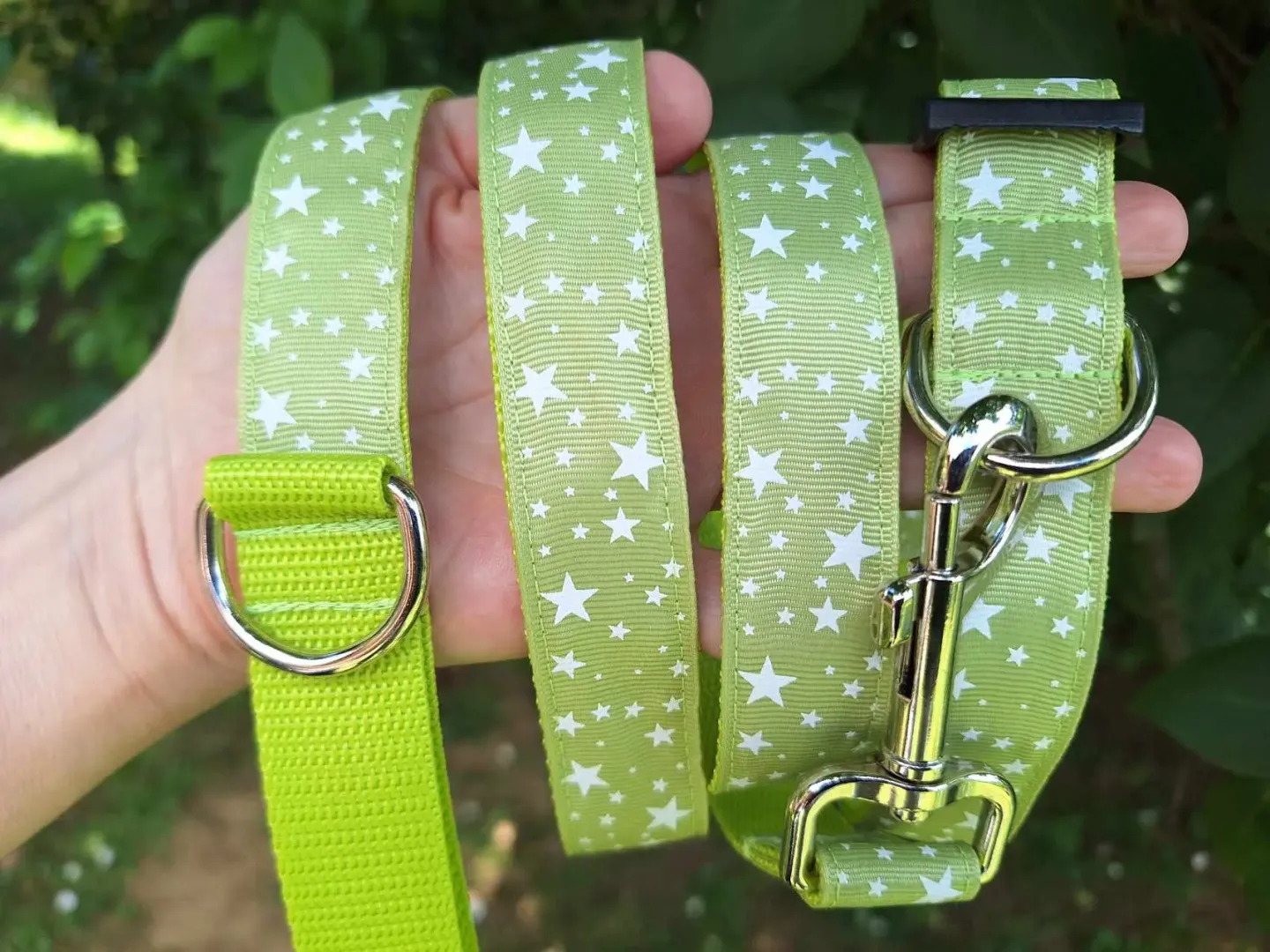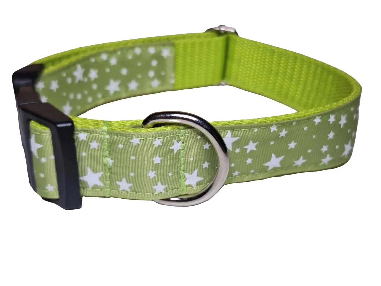 Ezt a nyakörvet közepes és nagyobb testű kutyáknak ajánljuk. A képen látható nyakörv zöld csillag mintás szalaggal és zöld hevederrel van varrva. De a felsorolt heveder színek közül bármelyikkel kérhető.