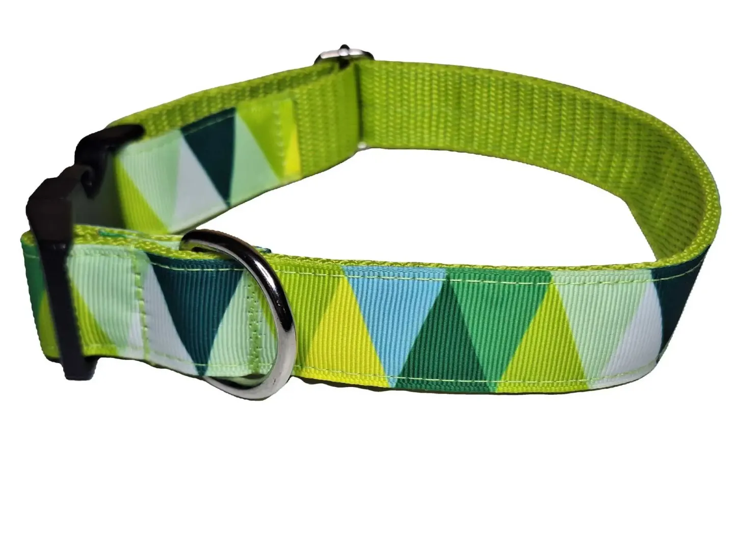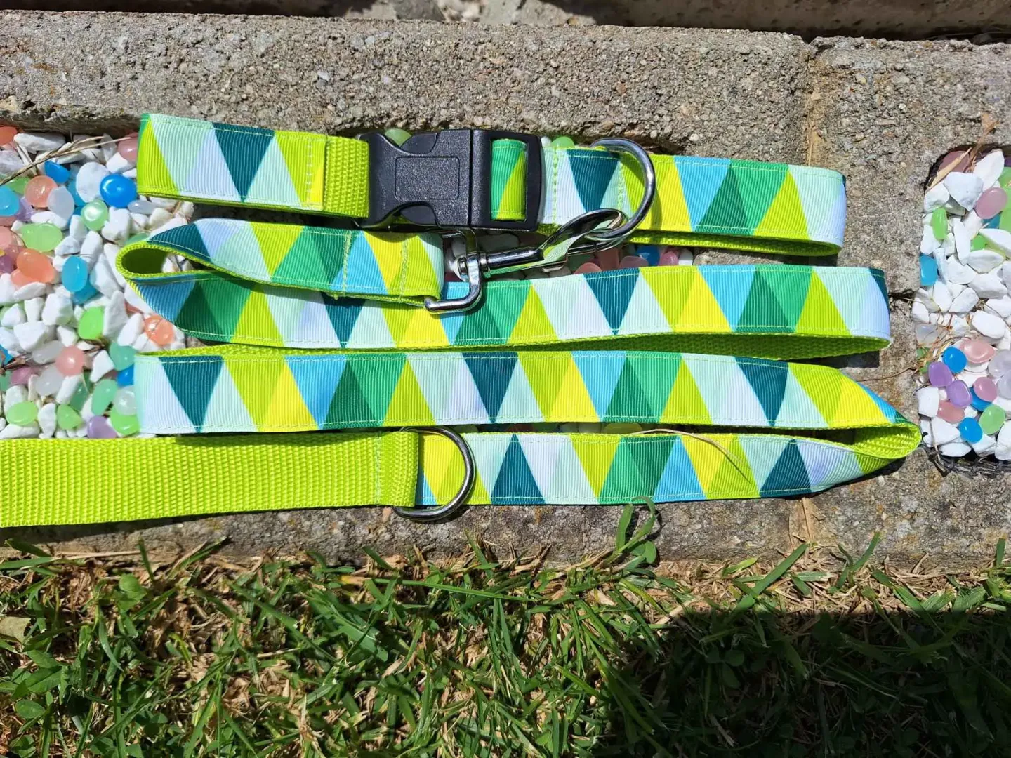 Ezt a nyakörvet közepes és nagyobb testű kutyáknak ajánljuk. A képen látható nyakörv zöld mozaik mintás szalaggal és zöld hevederrel van varrva. De a felsorolt heveder színek közül bármelyikkel kérhető.