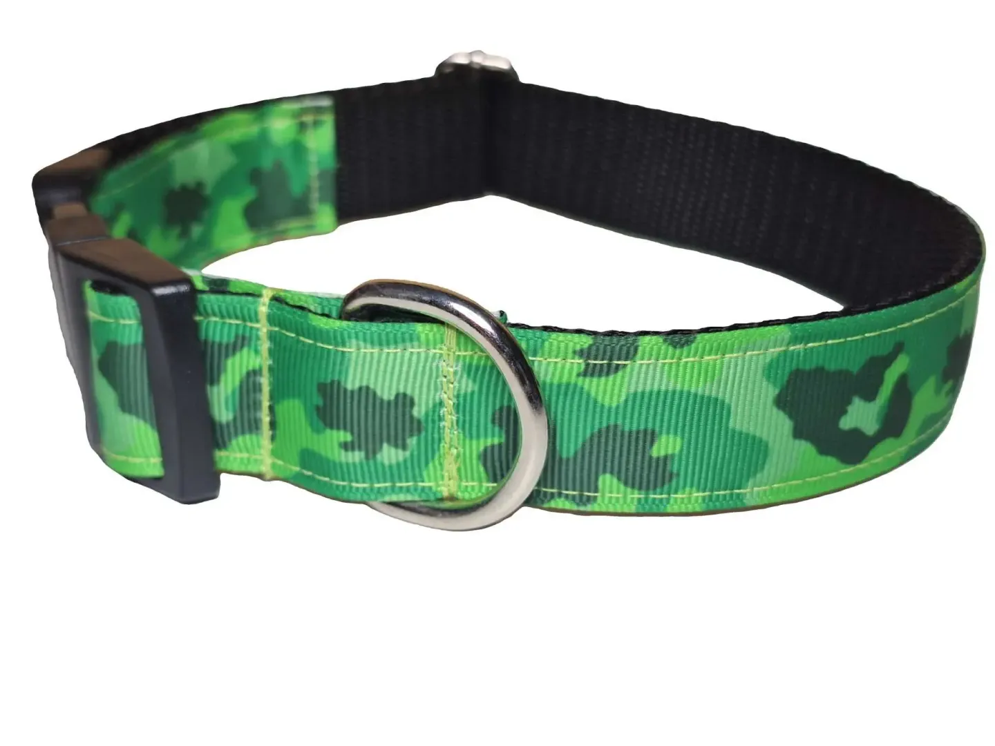 Ezt a nyakörvet közepes és nagyobb testű kutyáknak ajánljuk. A képen látható nyakörv és póráz zöld terepmintás szalaggal, és fekete hevederrel van varrva. De a felsorolt heveder színek közül bármelyikkel kérhető.